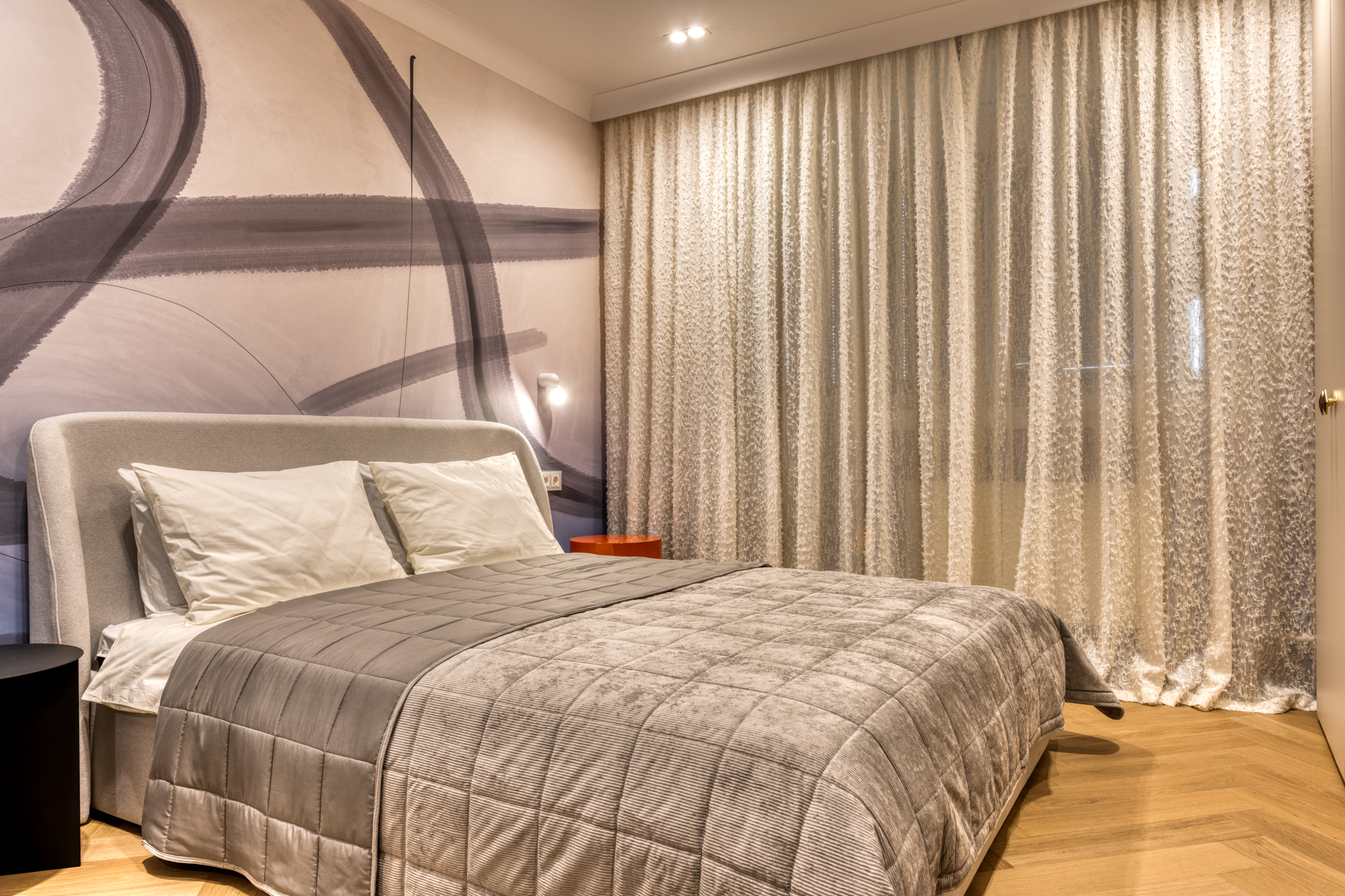 Для реализации проекта спальни дизайнер Марина Кутузова выбрала кварцевый паркет Дуб Лимба. Нейтральное светлое дерево стало идеальной платформой для реализации задумки с чёрными акцентами и контрастной стеной с каллиграфией, вокруг которой и построен весь интерьер.