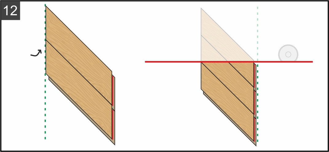 10.1. Начинайте сборку второго ряда, поочередно вставляя под углом плашки «В», следя за ровностью края аналогично первому ряду. Отрежьте край ряда по указанной на рисунке красной линии. В зависимости от типа пилы, которую вы используете, разберите плашки и отпилите каждую по отдельности или сделайте это уже в сборке, предварительно наметив линию при помощи угольника и карандаша.